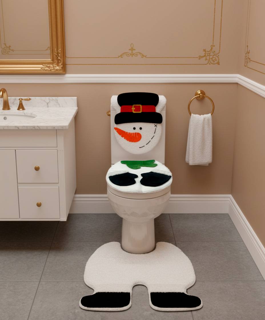 uego de Baño 3 Piezas – Ideal para decorar tu baño con un toque festivo. Incluye: 1 forro para tapa de cisterna, 1 forro para tapa bizcocho y 1 tapete. Diseño práctico y decorativo, fácil de colocar y mantener durante la temporada.