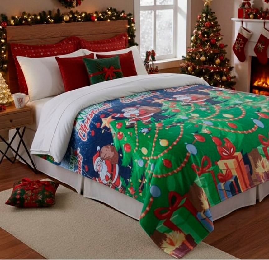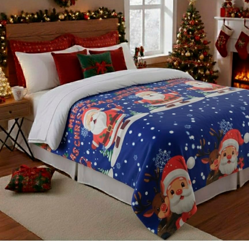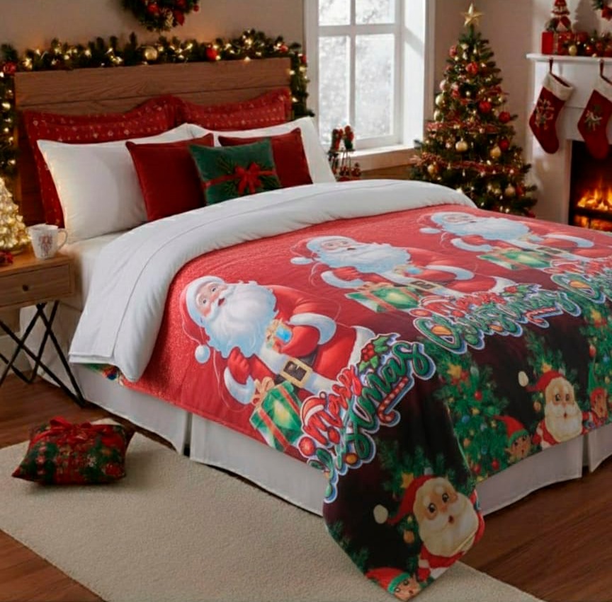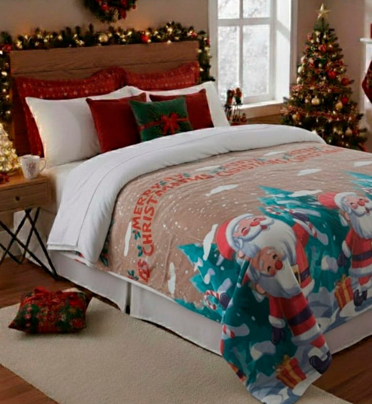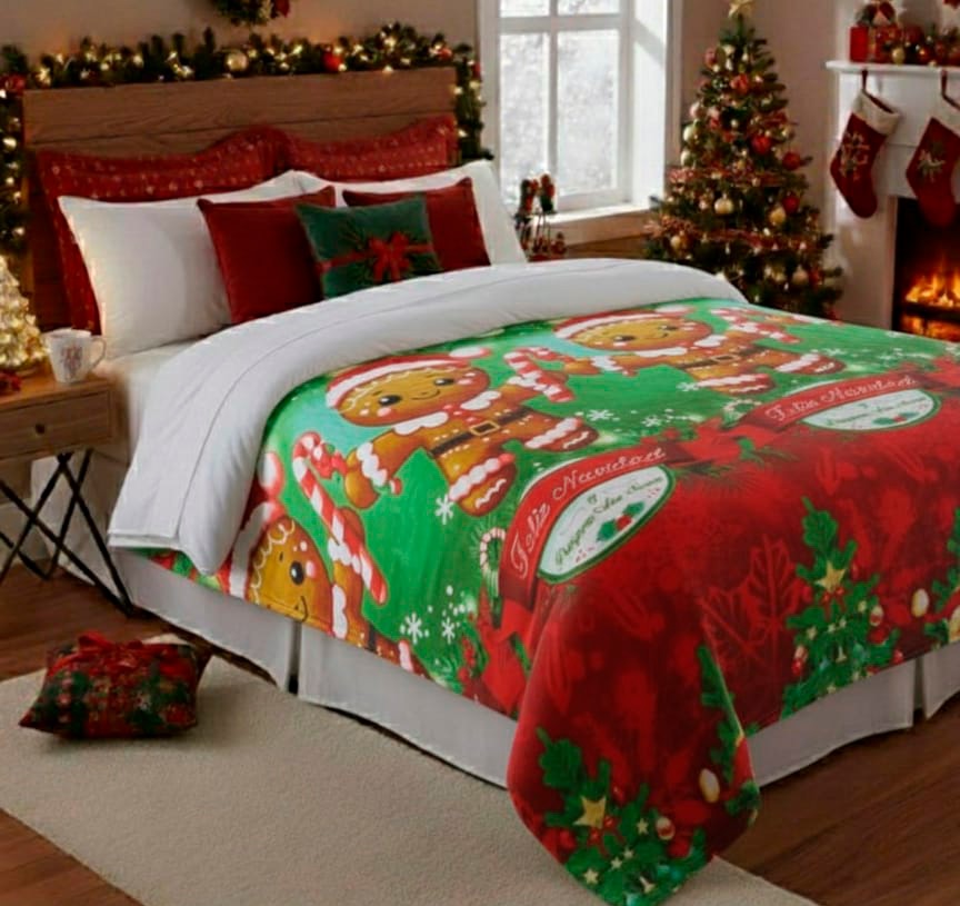 Abrigadora y decorativa, ideal para usar en cama o sofá. Tiene un diseño navideño de alta definición, es ligera, cómoda y de fácil cuidado. Perfecta para darle un toque festivo a tus espacios o para regalar.. Medidas: 180cm x 220cm.
