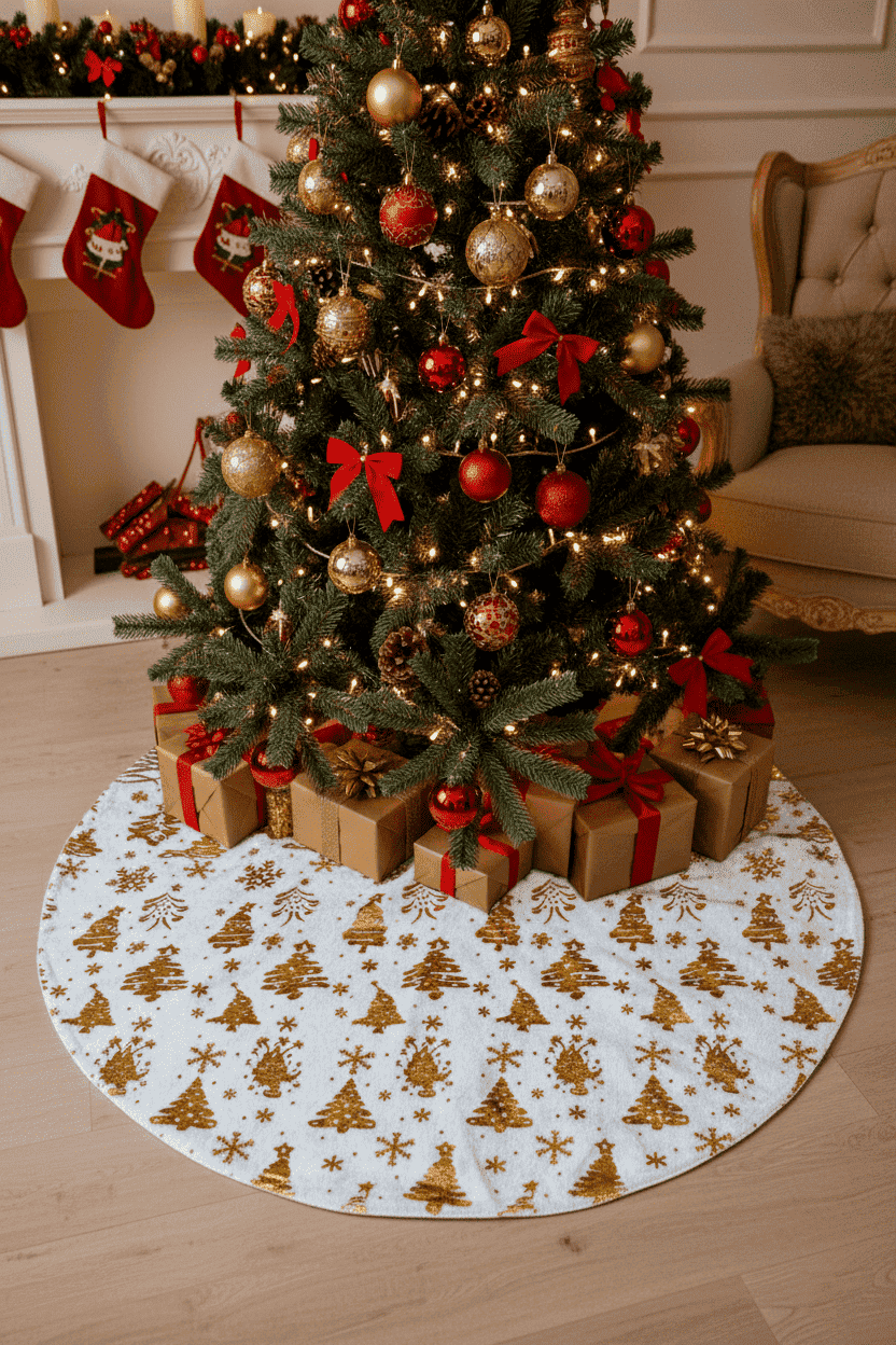 Elaborado en poliéster, combina estilo y espíritu navideño, protegiendo tu piso y realzando la decoración. Fácil de colocar y perfecto para complementar tu árbol y ambiente decembrino.