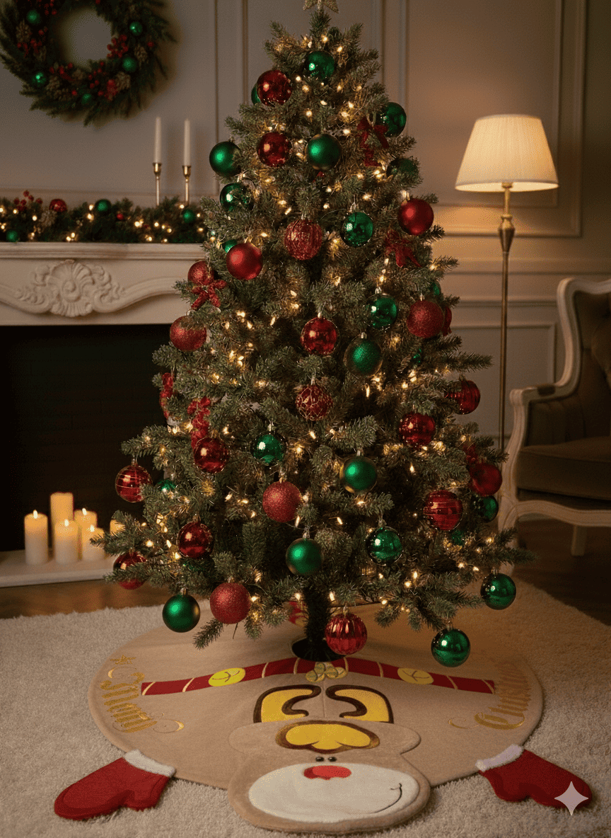 Pie de Árbol Navideño Cascabel – 1,5 metros de diámetro, ideal para decorar tu árbol con estilo festivo. Elaborado en poliéster, combina elegancia y espíritu navideño, protegiendo tu piso y realzando la decoración. Fácil de colocar y perfecto para complementar tu árbol y ambiente decembrino.