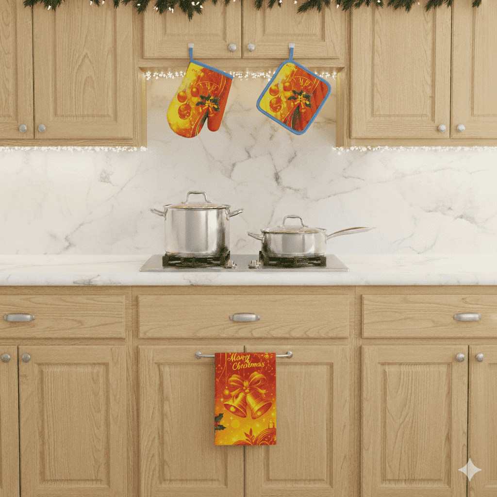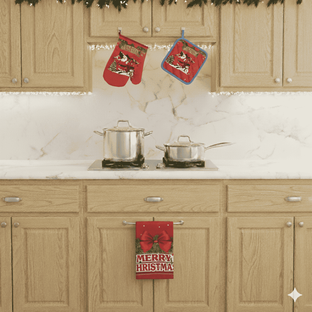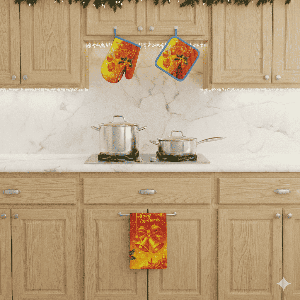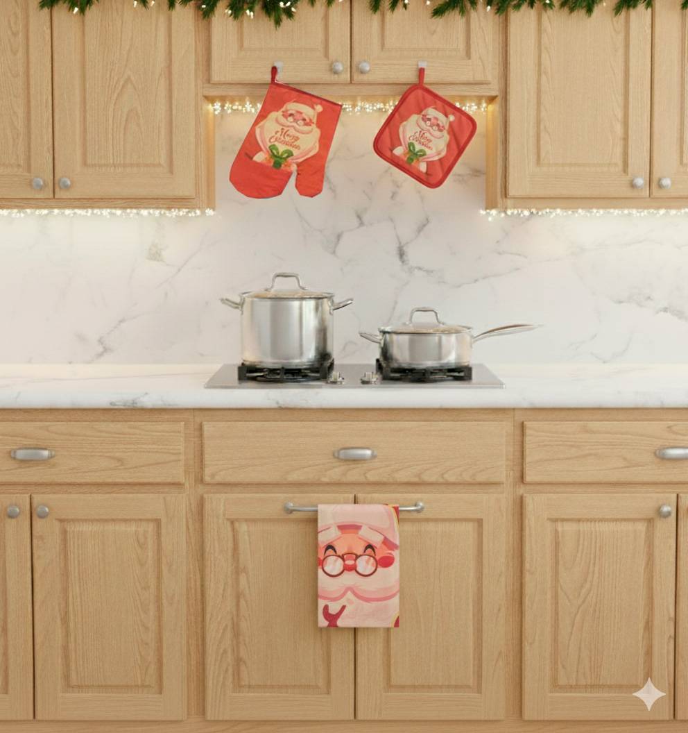Set Navideño de Cocina – 3 Piezas Dale un toque festivo a tu cocina con este encantador Set Navideño, perfecto para la temporada. Elaborado en poliéster de alta calidad, combina funcionalidad y estilo para acompañarte en tus preparaciones navideñas. Incluye: 1 guante térmico de 17 cm x 25 cm 1 sujetador/portaplatos de 17 cm x 17 cm 1 limpión de 40 cm x 60 cm Su diseño temático navideño aporta calidez y alegría al espacio, mientras que sus materiales resistentes garantizan comodidad y seguridad al cocinar. Ideal para uso diario o como un detalle perfecto para regalar.