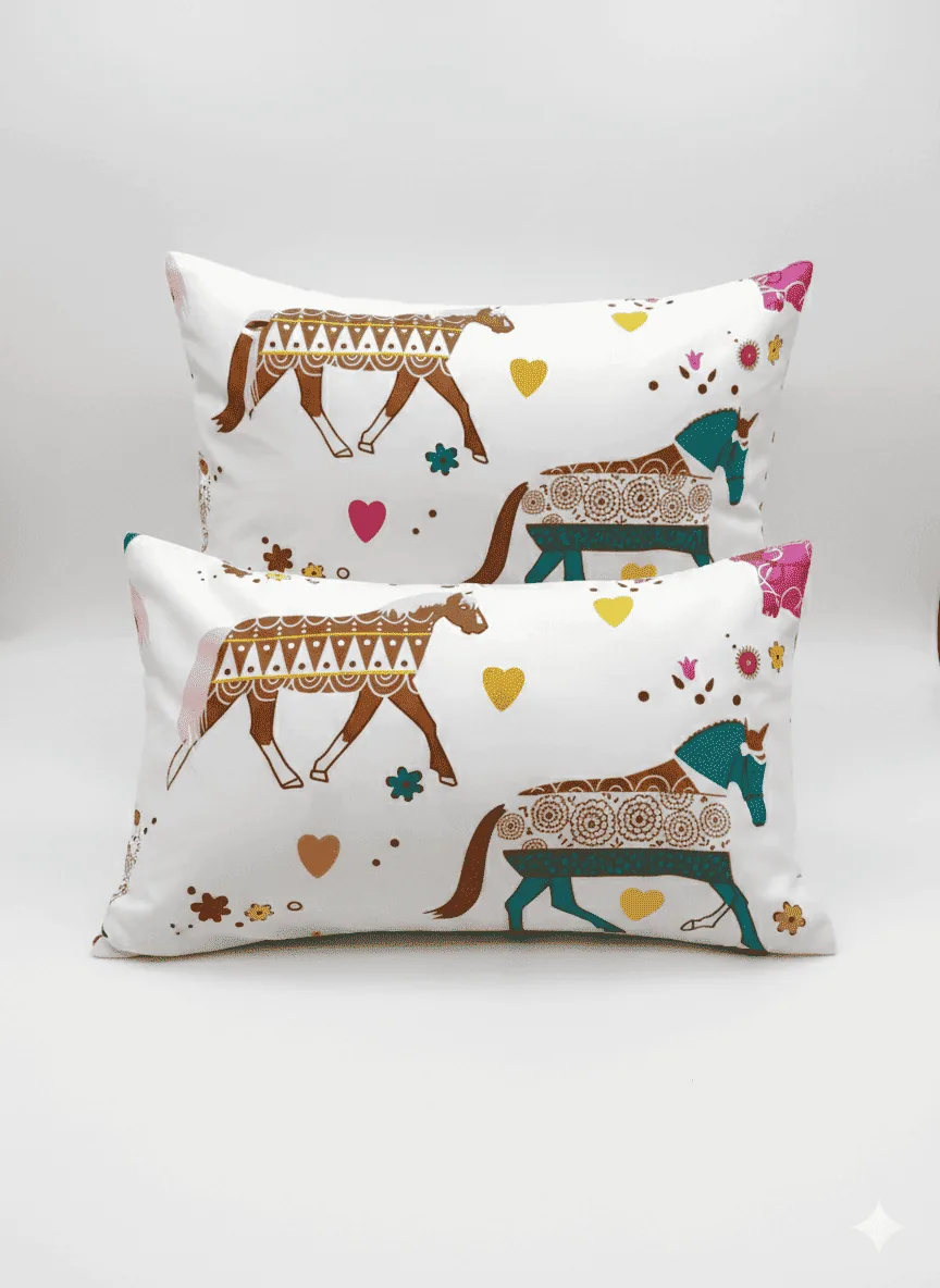 Renueva tus espacios con par de fundas estampadas, textil y accesorio de calidad.