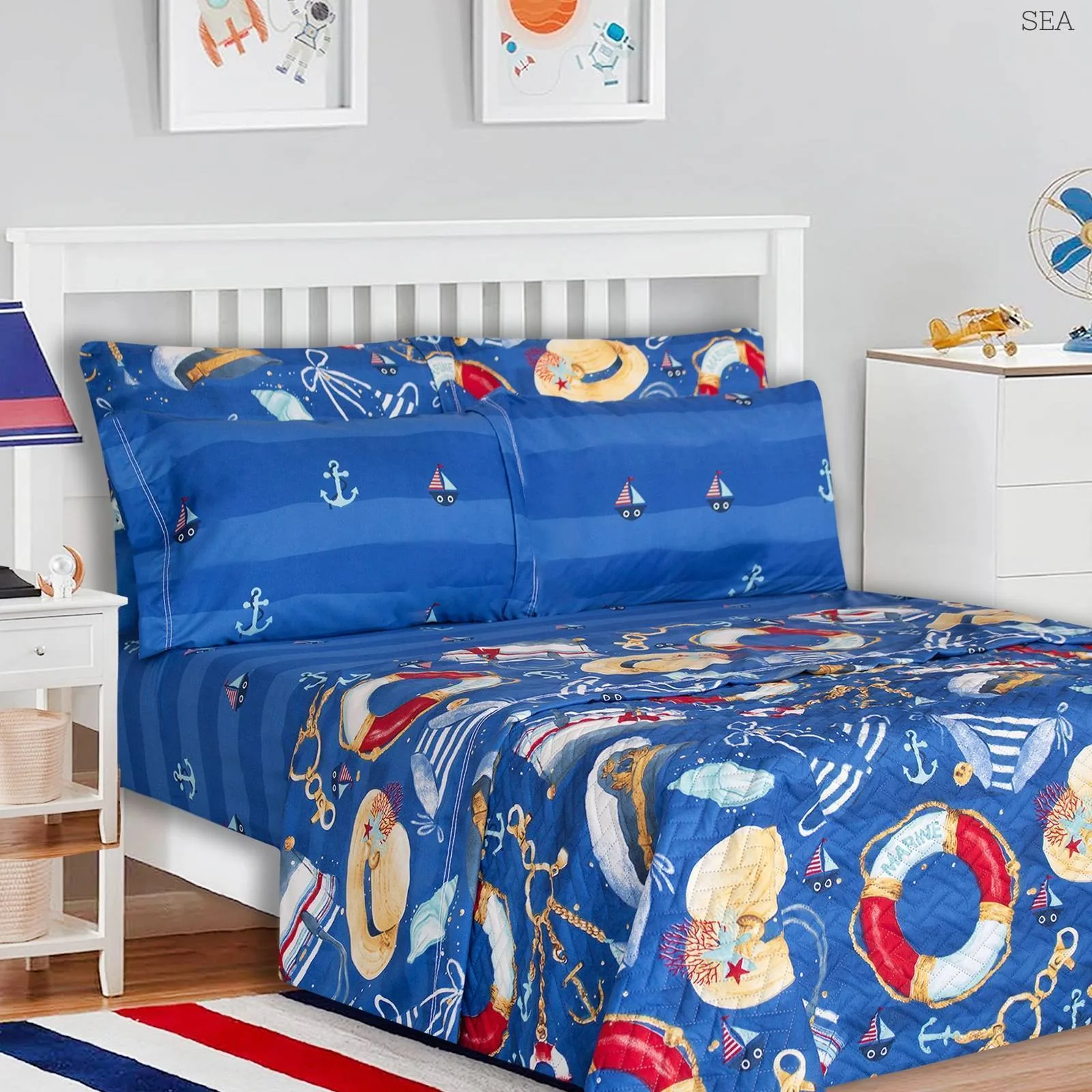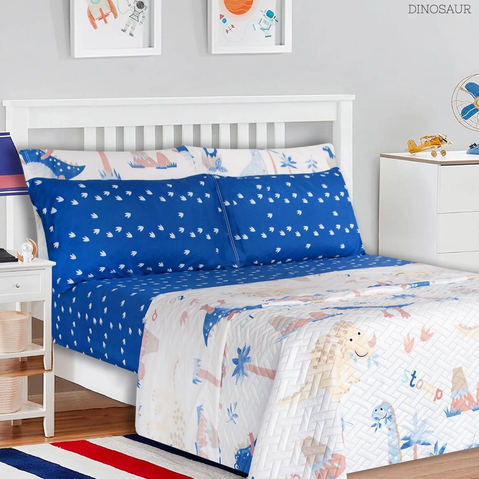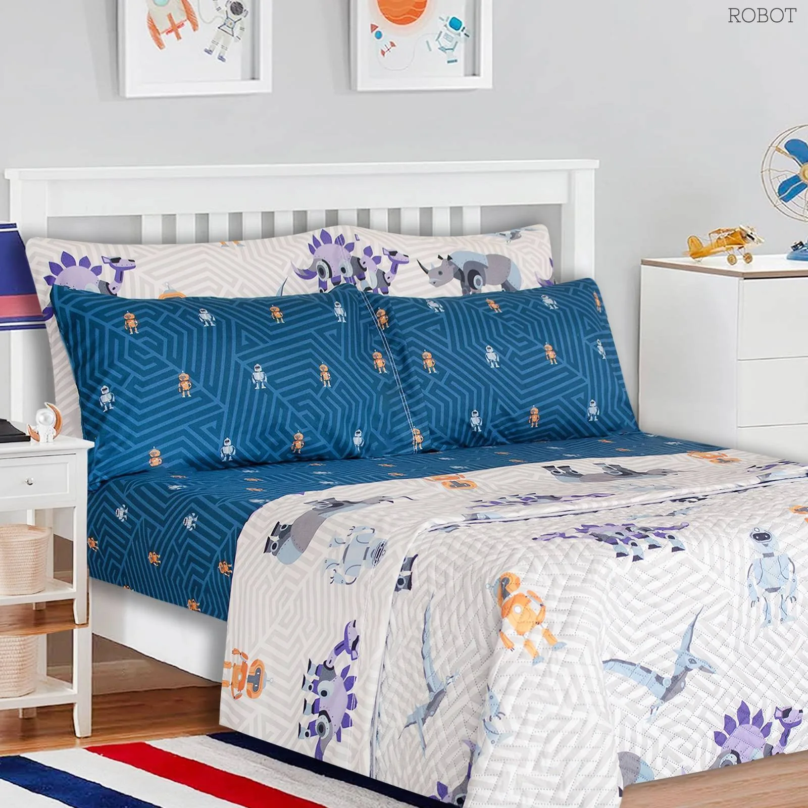 Medida: para cama de 1,40mtr incluye: 1 sobre sábana de 190cm X 245cm + 1 sábana ajustable de 140cm X 190cm-30cm de cajón + 2 fun- das para almohadas de 50cm X 70cm whale dog danger dinosaur sea robot.