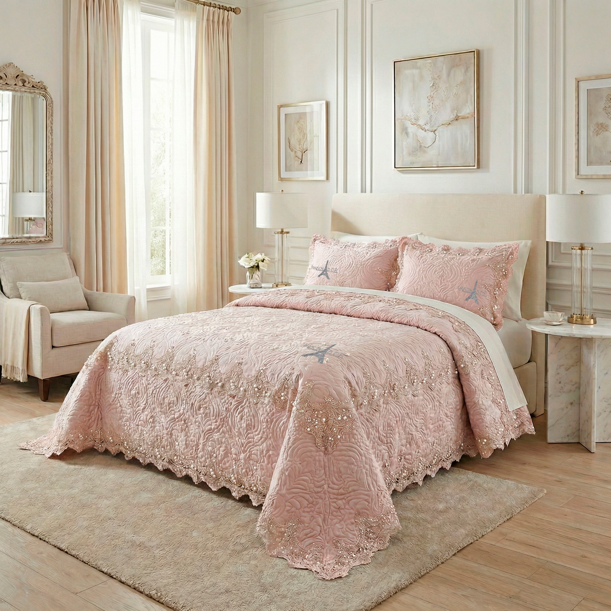 Full queen - tendido de cama premium con detalles en érlas Y encaje full queen para cama de 1,40mtr O de 1,60mtr medida: 230cm de ancho X 250cm de largo + 2 fundas para almohadas de 50cm X 70cm. Rosa champ aña café.