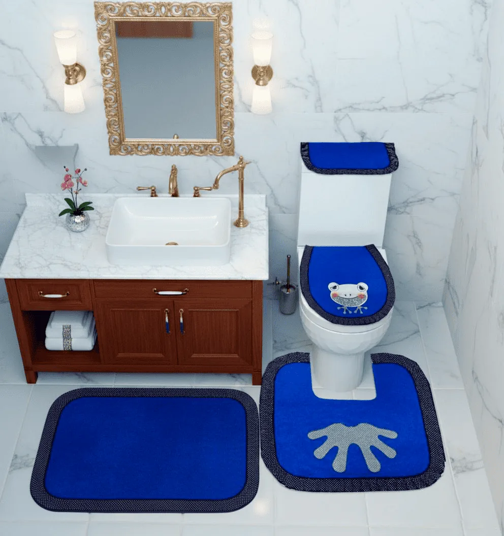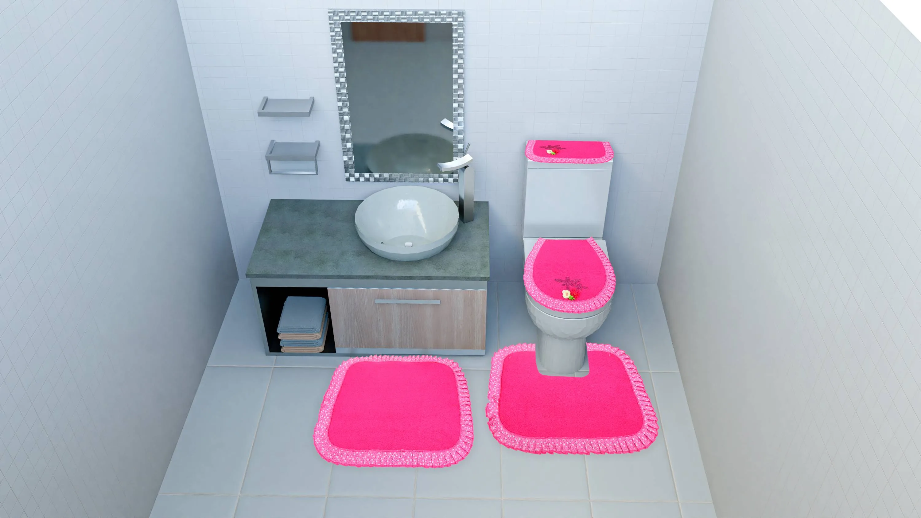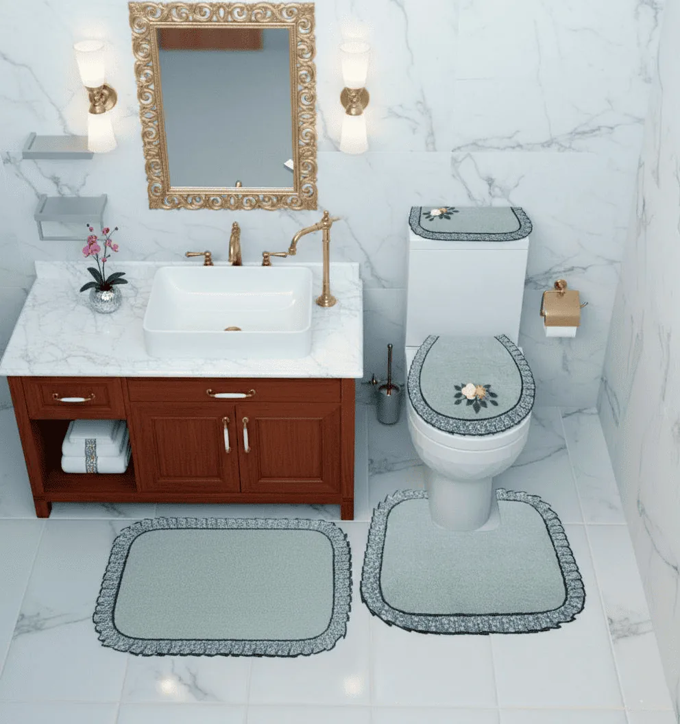 Juego de baño por 4 piezas en tela toalla incluye: forros tapa cisterna, forro tapa bizcocho, tapete entrada.