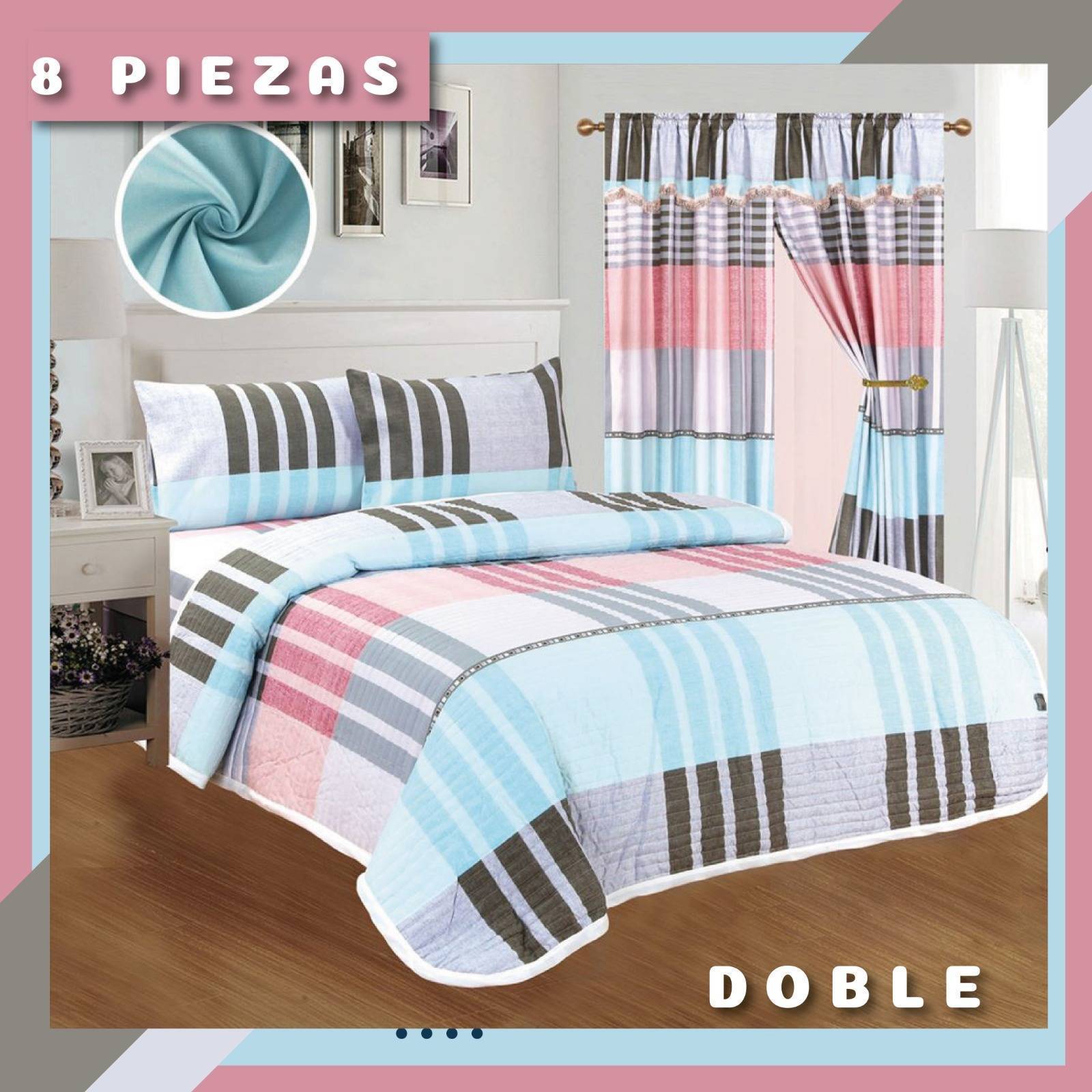 Doble - doble para cama de 1,40mtr -imcluye: 1 tendido de 215cm de ancho X 240cm de largo + 1 sábana ajustable de 137cm de ancho X 193 CM de largo-20cm de cajón + dos fundas para almohadas de 51cm X 76cm + 2 paneles de cortinas con velo + 2 sujetadores..
